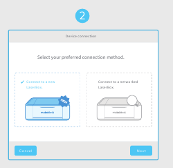 - Öffnen Sie die Software, wählen Sie "Connect to a new Laserbox" (Mit einer neuen Laserbox verbinden) und klicken Sie auf "Next" (Weiter).
