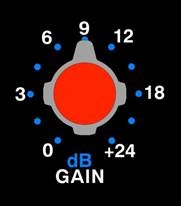 Die GAIN-Skala zeigt den Betrag der Gain Reduction während der Kompression an, wobei der Nullpunkt ganz rechts liegt, um eine höhere Auflösung der Gain-Reduction-Skala zu ermöglichen. Der Messbereich reicht von 0 (keine Gain Reduction) bis 20dB Gain Reduction.