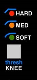 Der 3-Positionen-KNEE-Schalter passt die Form der Kurve zu Beginn der Kompression für eine "overeasy" (sanfter Knick)-Typ-Kompression an, was zu einem sehr natürlichen, unkomprimierten Klang führt, oder einen typischen steilen KNEE-Typ, der sich für einen viel stärkeren Limiting-Effekt eignet.