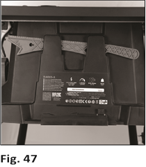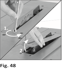 - Entfernen Sie die Zugangsplatte, indem Sie die Feststellschraube um ¼ Umdrehung drehen und die Zugangsplatte vorsichtig vom Tisch heben (Abb. 48). Bewahren Sie die Zugangsplatte sicher für die zukünftige Verwendung auf.