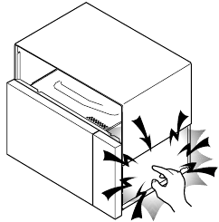 - Prüfen Sie auf Leckagen an der Türscheibe, an Blechnähten und an anderen zugänglichen Stellen, an denen die Metallkontinuität unterbrochen wurde (z. B. um die Schalter, Anzeige und Lüftungsschlitze).