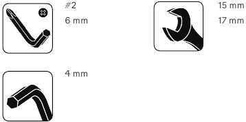 - Verwenden Sie die empfohlenen Schraubenschlüssel und drehen Sie die Schrauben und Muttern nach rechts (im Uhrzeigersinn), um sie festzuziehen, und nach links (gegen den Uhrzeigersinn), um sie zu lösen, sofern nicht anders angewiesen.