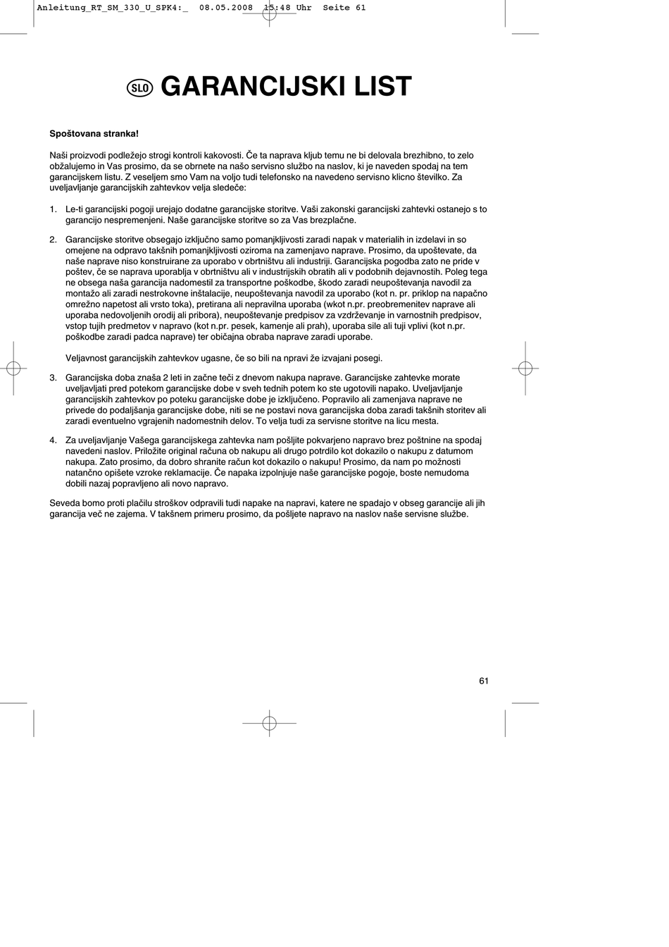 garancijskem listu. Z veseljem smo Vam na voljo tudi telefonsko na navedeno servisno klicno številko. Za