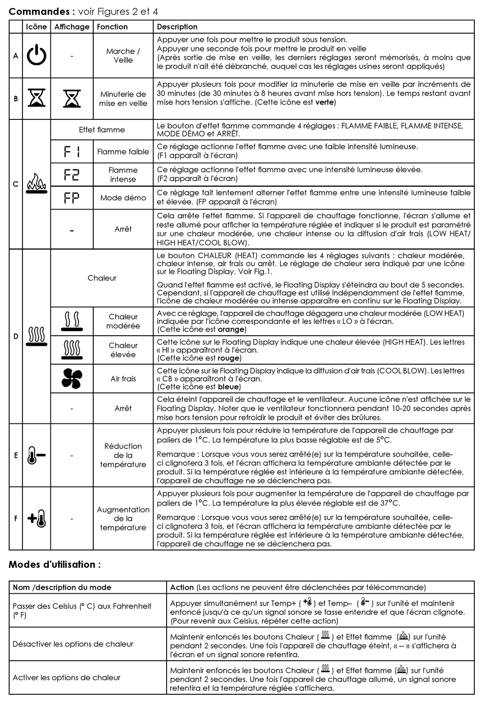 Cela arrête l'effet flamme. Si l'appareil de chauffage fonctionne, l'écran s'allume et