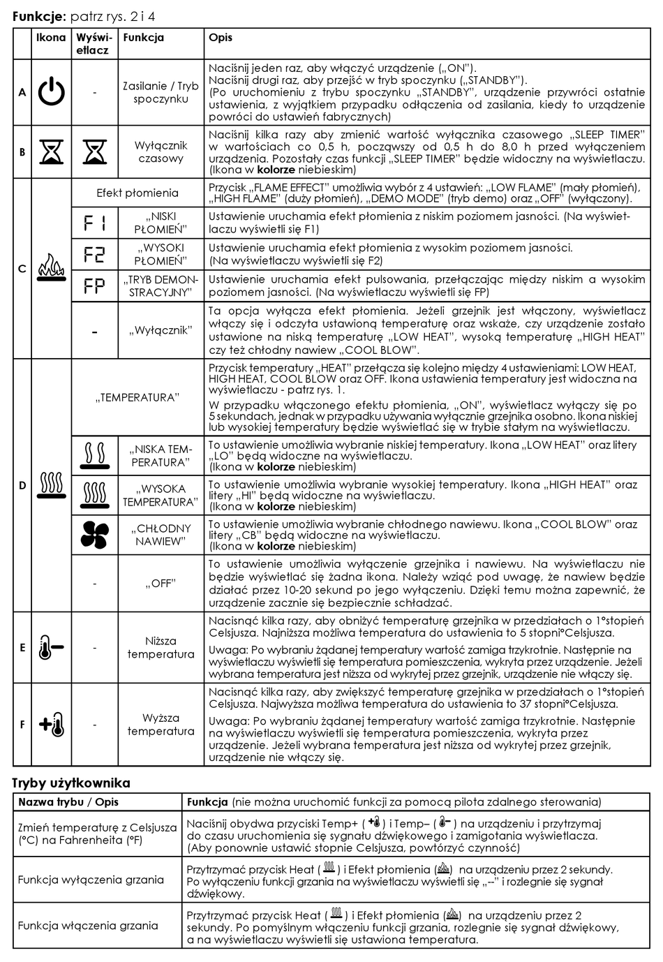 Ta opcja wyłącza efekt płomienia. Jeżeli grzejnik jest włączony, wyświetlacz