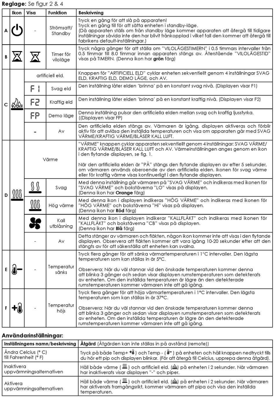 om värmaren används oberoende av den artificiella elden. Ikonen för svag värme