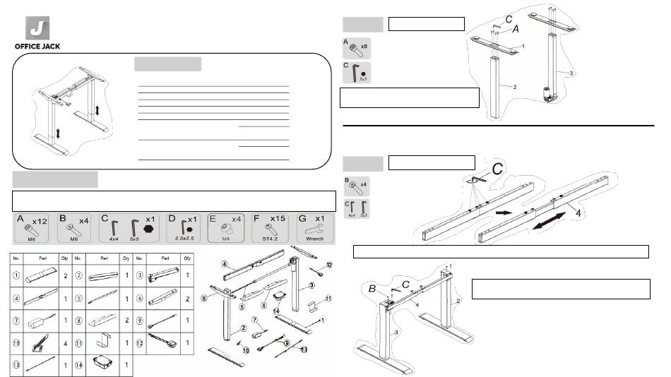 JacksBasic® Schritt 1 Sockel montieren [1] Montageanleitung Technische Daten Hub-Säulen Maximale Belastung 70Kg Montieren Sie [1] & [2] [3], verwenden Sie den Geschwindigkeit 25mm/s 5x5 Inbusschlüssel (C) für die Schrauben(A). Spannung 100-240V Verstellbereich 710 – 1210mm Schreibtisch Größe 1000 – 1600 mm 500 –...