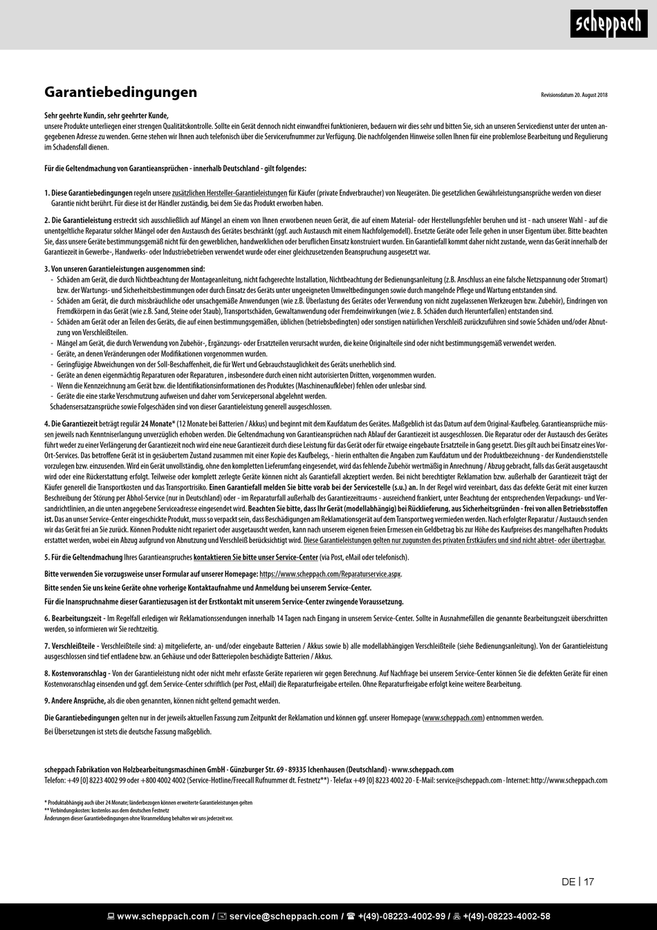 Die Garantiebedingungen gelten nur in der jeweils aktuellen Fassung zum Zeitpunkt der Reklamation und können ggf. unserer Homepage (www.scheppach.com) entnommen werden.