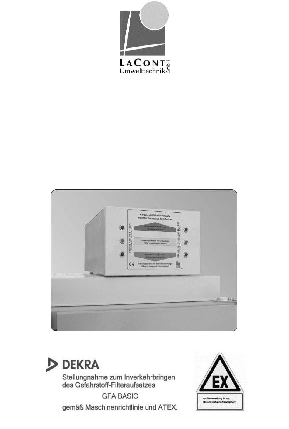 Handhabung des Gerätes hervorgerufen wurde. Einführung Der Gefahrstoff-Filteraufsatz GFA Basic ist ein kompaktes Gerät und dient der technischen Entlüftung von Gefahrstoffschränken. Er ist geeignet für die von Lacont benannten Schrankmodelle, sowie auch für den Einsatz auf Gefahrstoffschränken, auch auf Doppel-Tür-Gefahr- stoffschränken anderer Hersteller vorgesehen. Sein Einsatz findet im Umluftbetrieb statt..