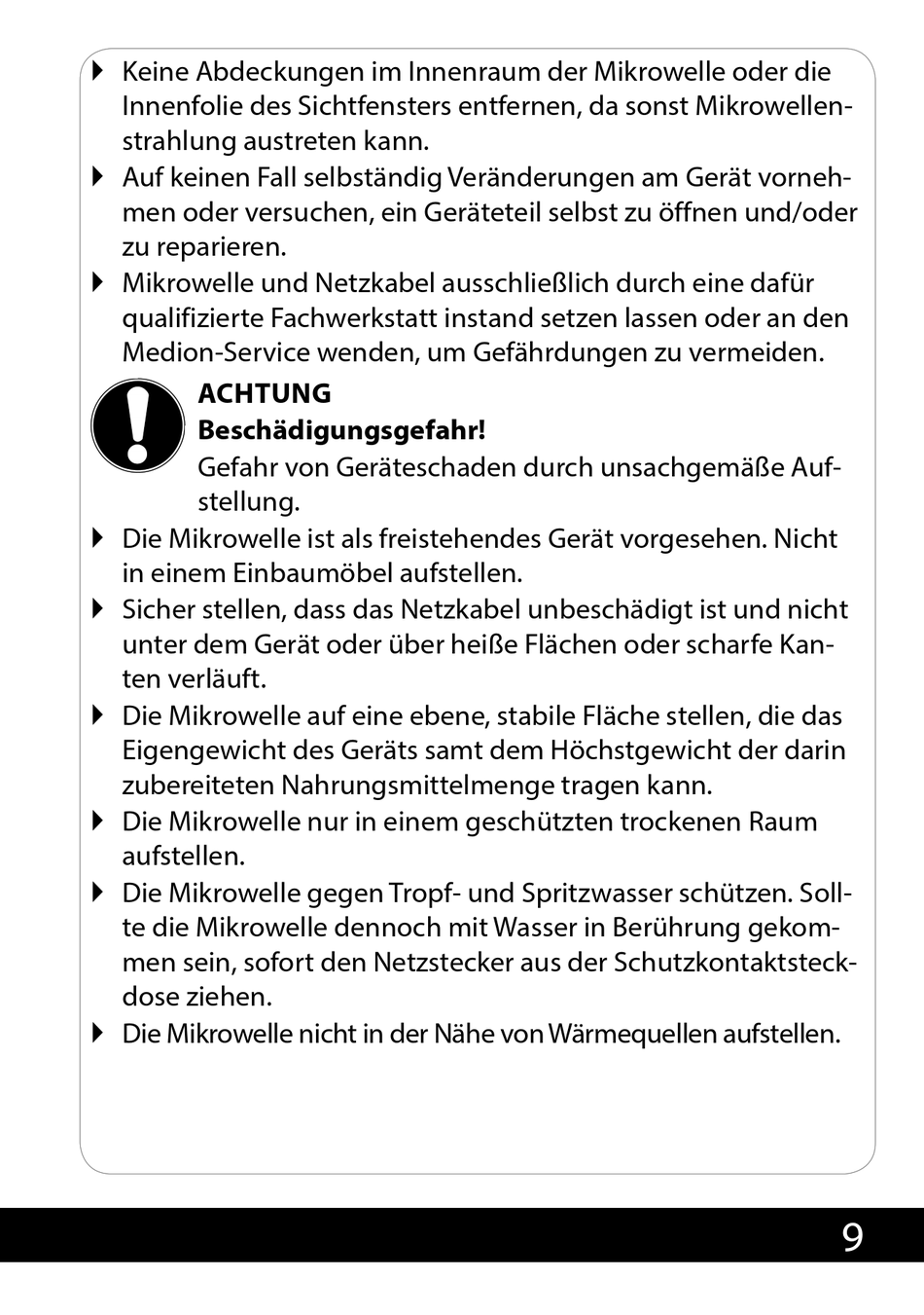 Die Mikrowelle gegen Tropf- und Spritzwasser schützen. Soll-