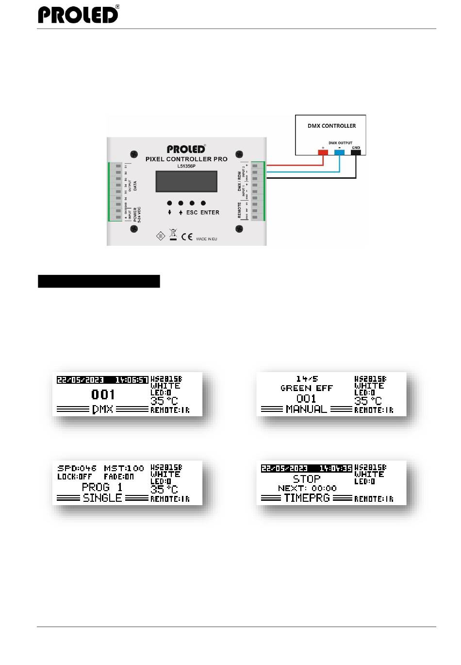 Der Controller kann über Standard DMX-512 Signal gesteuert werden. Sobald die Einstellung 1024Ch gewählt