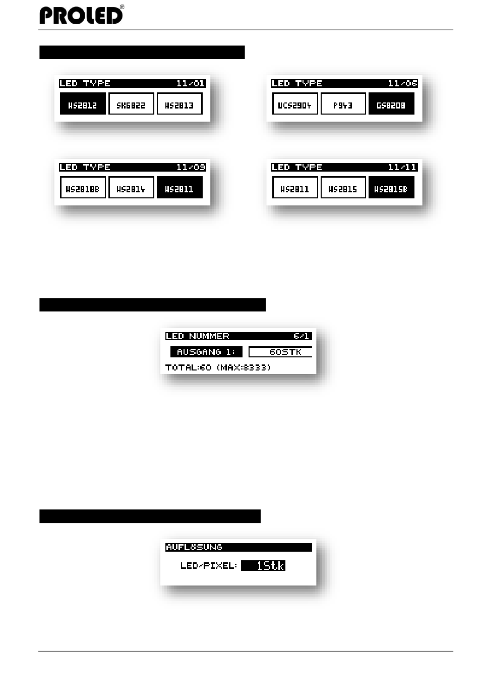 Im AUFLÖSUNG-Menü kann angegeben werden, aus wie vielen LEDs ein Pixel besteht. Es können Werte