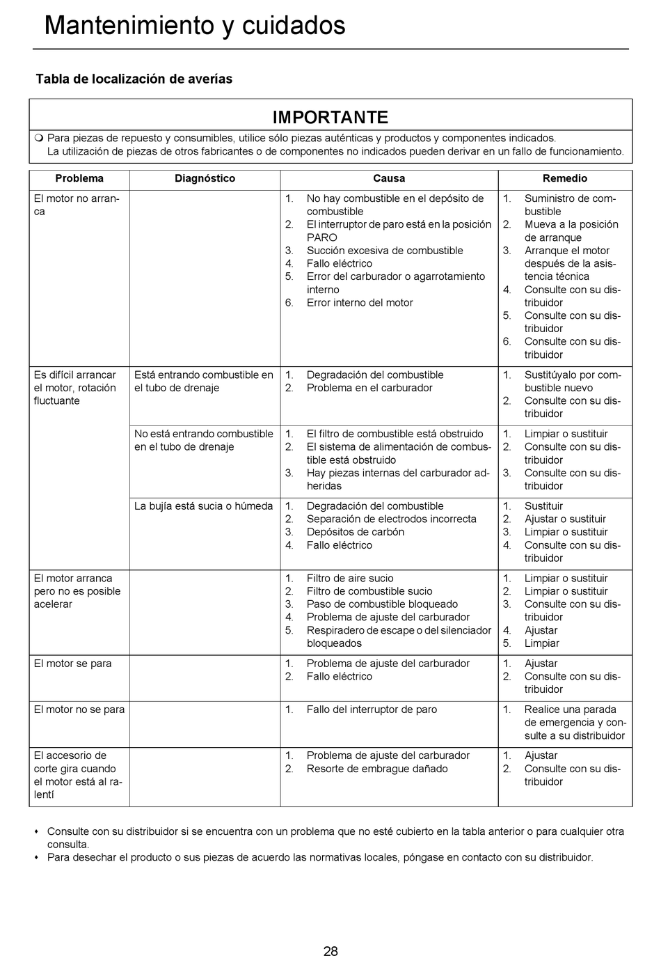 Consulte con su distribuidor si se encuentra con un problema que no esté cubierto en la tabla anterior o para cualquier otra