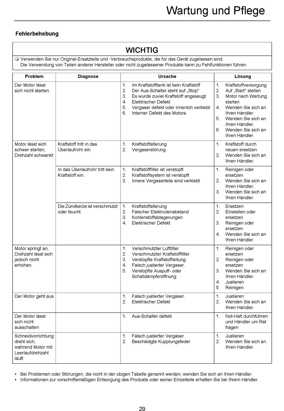 Bei Problemen oder Störungen, die nicht in der obigen Tabelle genannt werden, wenden Sie sich an Ihren Händler.