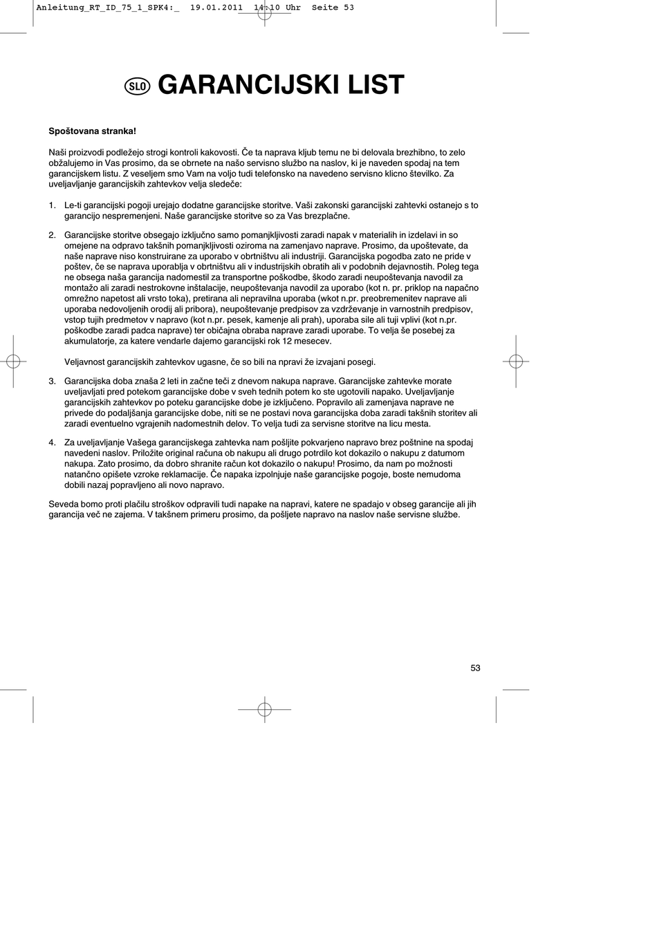 garancijskem listu. Z veseljem smo Vam na voljo tudi telefonsko na navedeno servisno klicno številko. Za