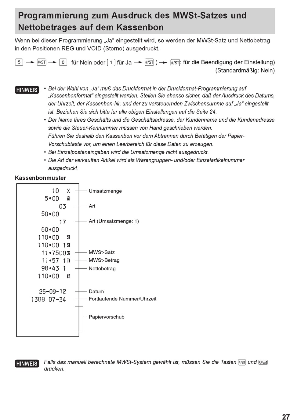 Wenn bei dieser Programmierung „Ja" eingestellt wird, so werden der MWSt-Satz und Nettobetrag