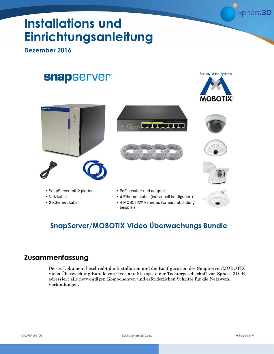 • 4 MOBOTIX™ kameras (variiert, abbildung beispiel) SnapServer/MOBOTIX Video Überwachungs Bundle Zusammenfassung Dieses Dokument beschreibt die Installation und die Konfiguration des SnapServer/MOBOTIX Video Überwachung Bundle von Overland Storage, einer Tochtergesellschaft von Sphere 3D. Es adressiert alle notwendigen Komponenten und erforderlichen Schritte für die Netzwerk Verbindungen.