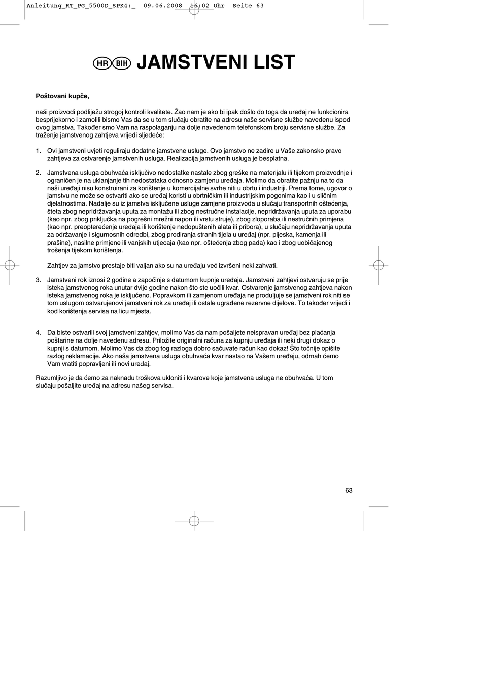 3. Jamstveni rok iznosi 2 godine a započinje s datumom kupnje uređaja. Jamstveni zahtjevi ostvaruju se prije
