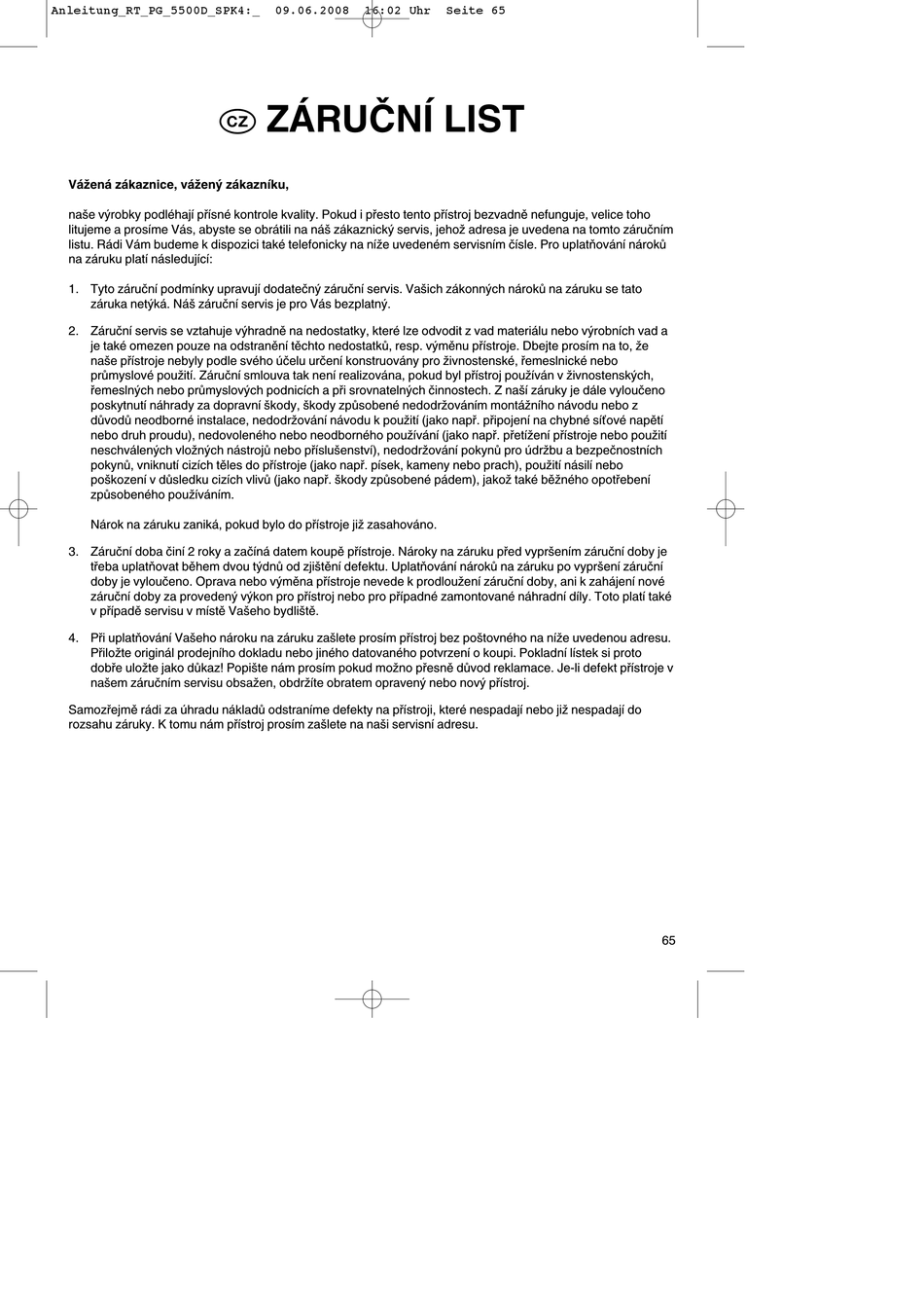 doby je vyloučeno. Oprava nebo výměna přístroje nevede k prodloužení záruční doby, ani k zahájení nové