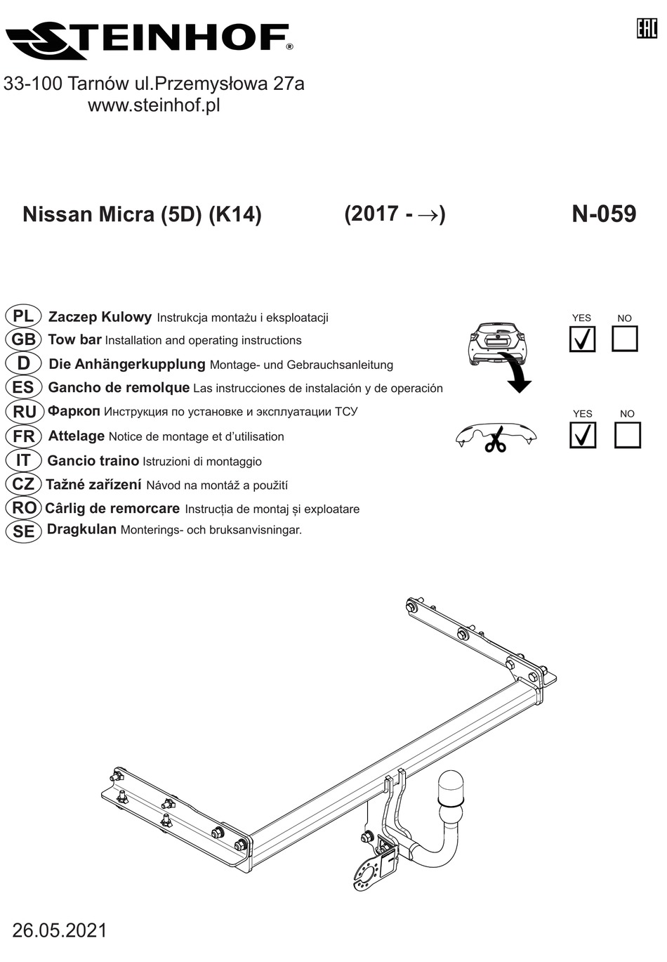 33-100 Tarnów ul.Przemysłowa 27a www.steinhof.pl N-059 (2017 - ®) Nissan Micra (5D) (K14) Zaczep Kulowy Instrukcja montażu i eksploatacji NISSAN Tow bar Installation and operating instructions Die Anhängerkupplung Montage- und Gebrauchsanleitung Gancho de remolque Las instrucciones de instalación y de operación Фаркоп...