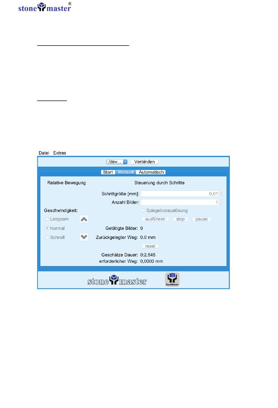 ten zu steuern. Mit den Pfeiltasten kann der Schlitten des StackMasters nach oben oder unten