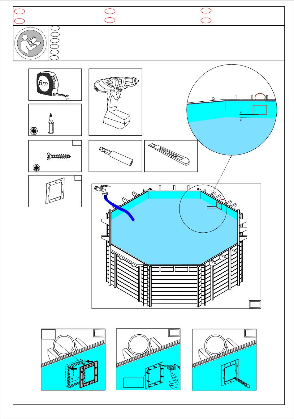 Setzen Sie das Füllen mit Wasser fort. Schneiden Sie eine Öffnung in der Stelle vom Skimmer (P0) aus.