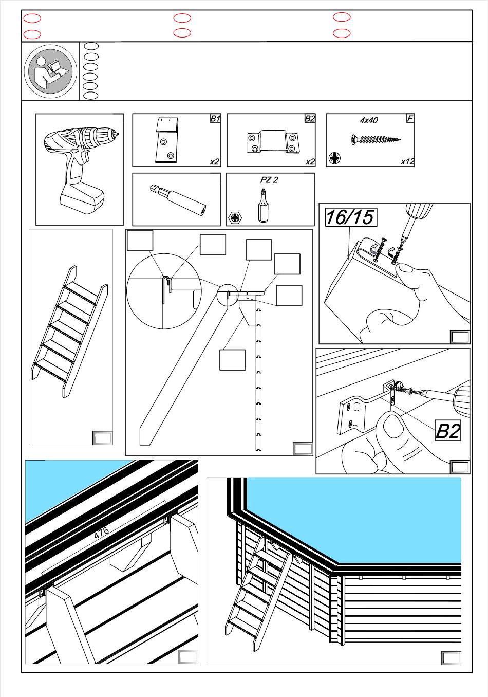Le montage des boucles et des gâches (B1, B2). Fixez l'escalier sur la paroi avec le renfort d'escalier (13).