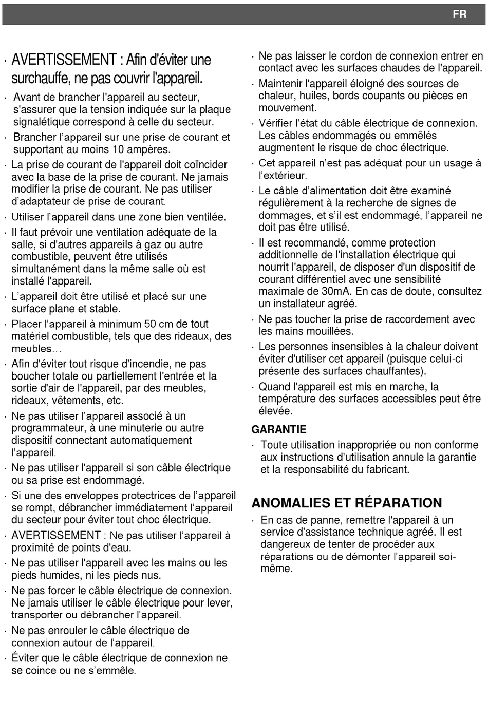 AVERTISSEMENT : Ne pas utiliser l'appareil à