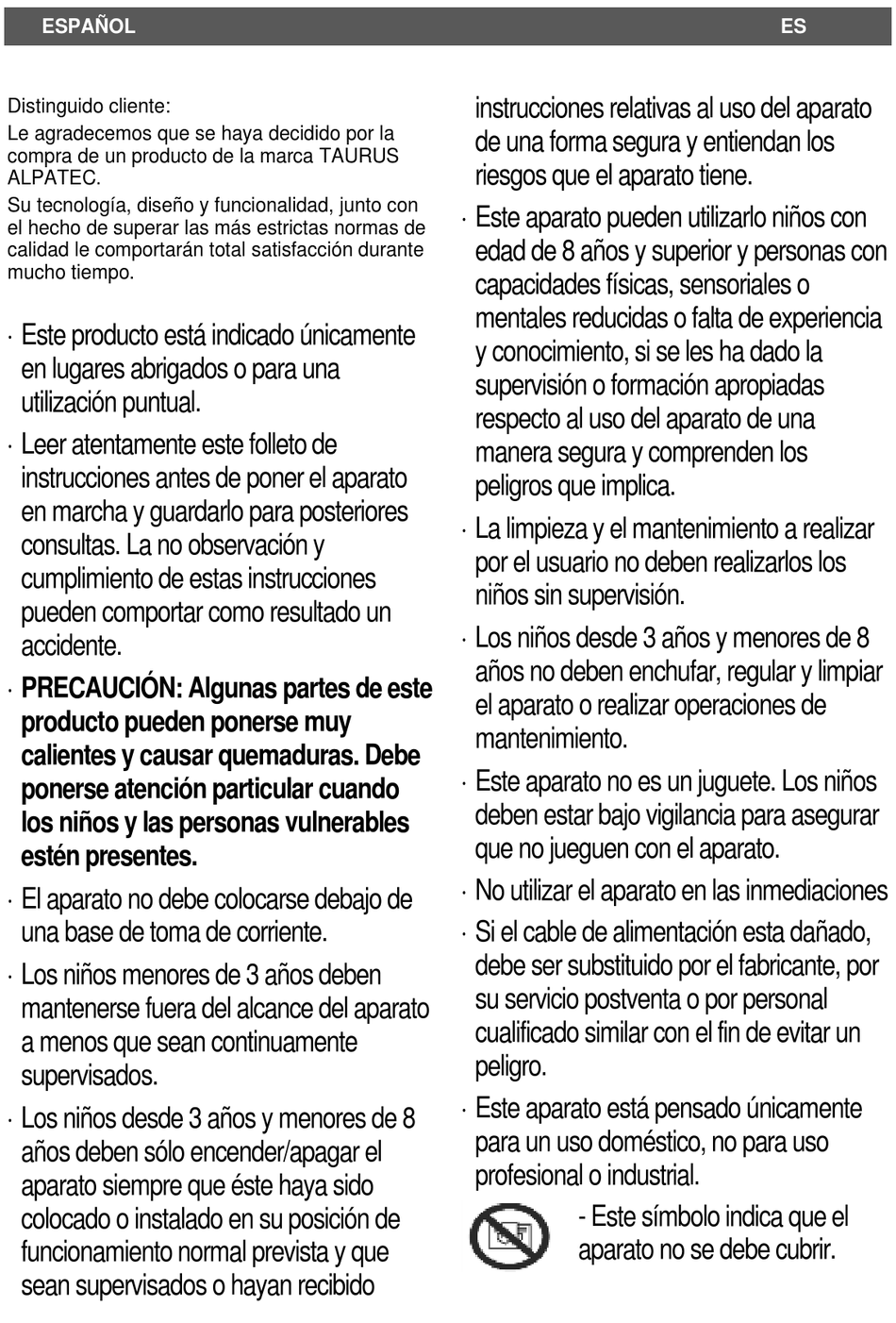 aparato no se debe cubrir.