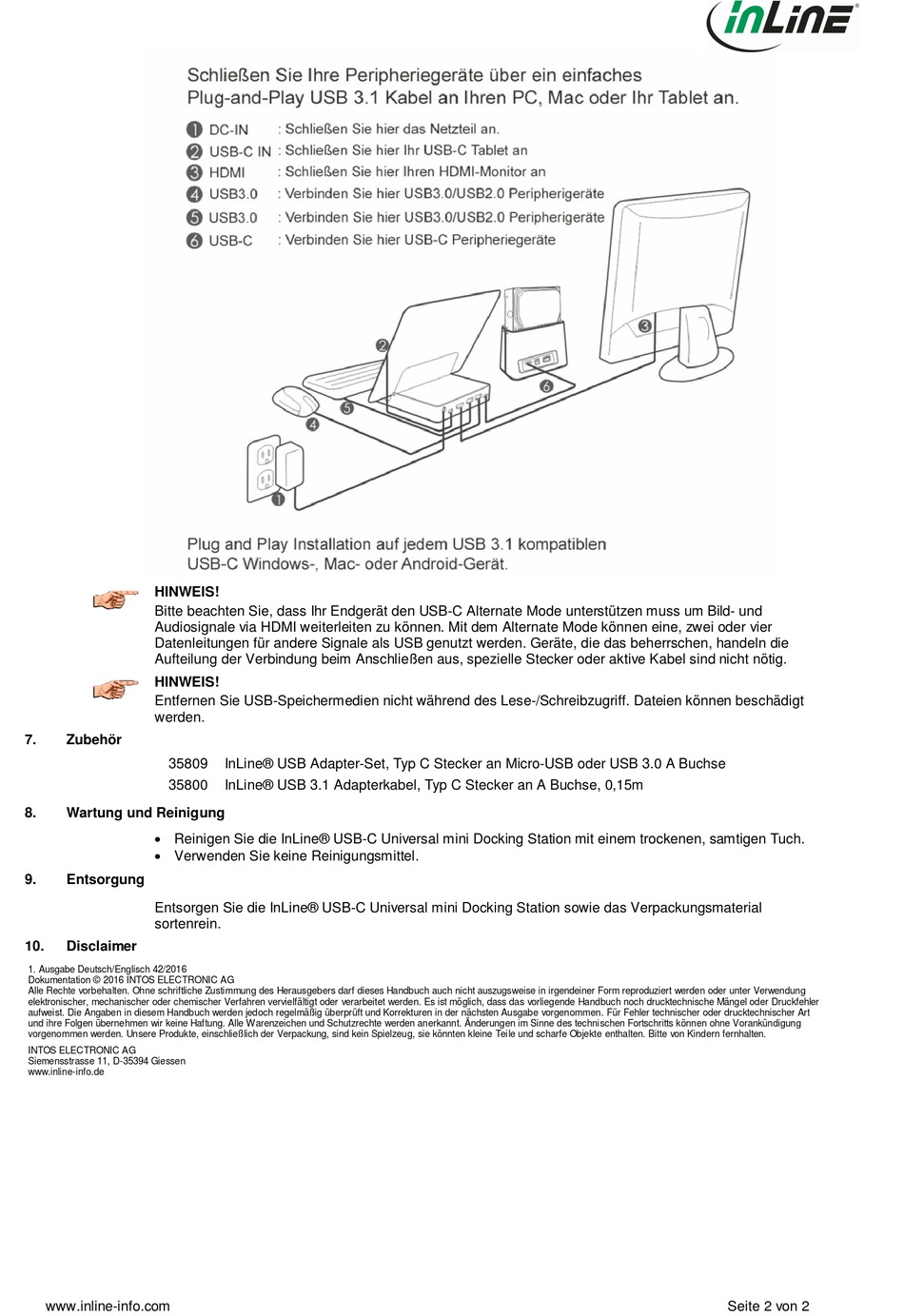� Reinigen Sie die InLine® USB-C Universal mini Docking Station mit einem trockenen, samtigen Tuch.