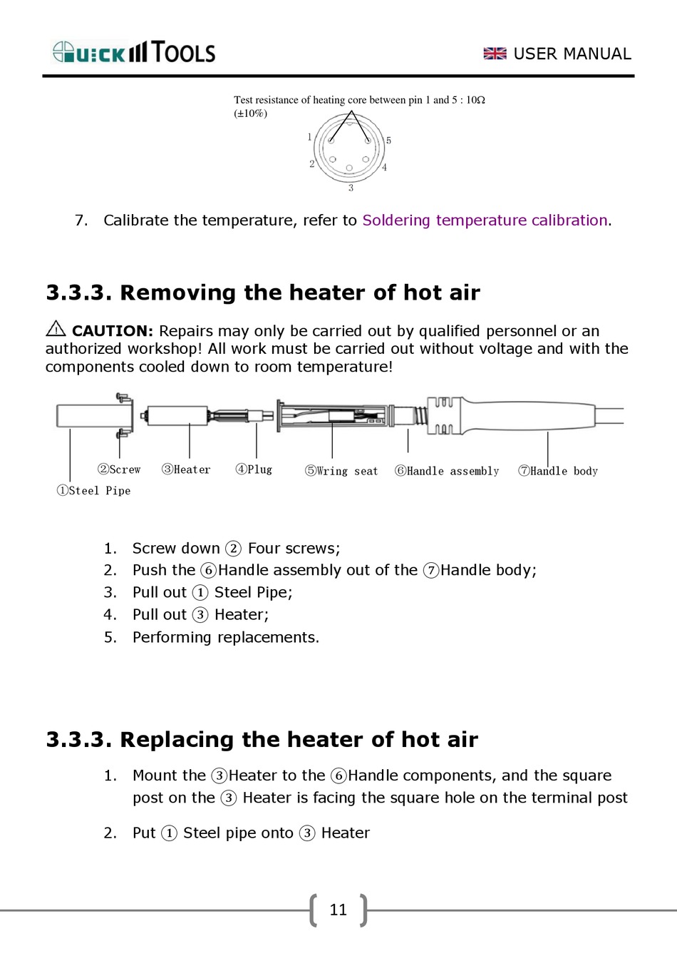 Test resistance of heating core between pin 1 and 5 : 10Ω