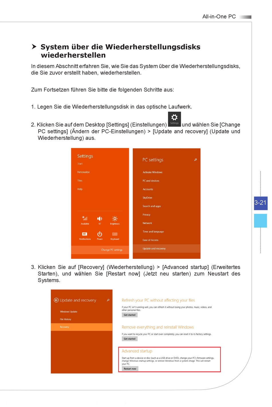 3� Klicken Sie auf [Recovery] (Wiederherstellung) > [Advanced startup] (Erweitertes
