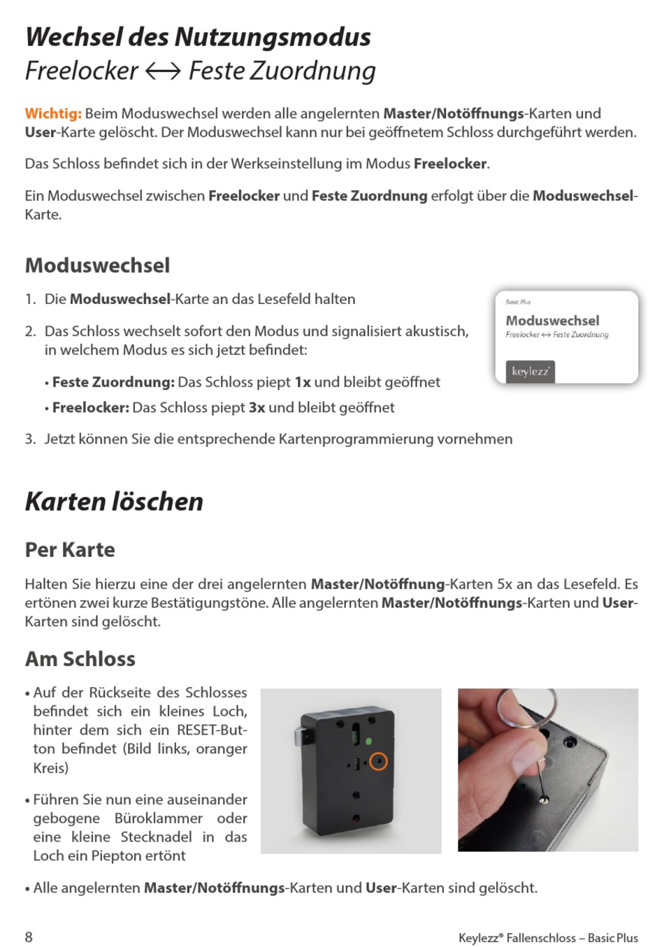 Beim Moduswechsel werden alle angelernten Master/Notöffnungs-Karten und