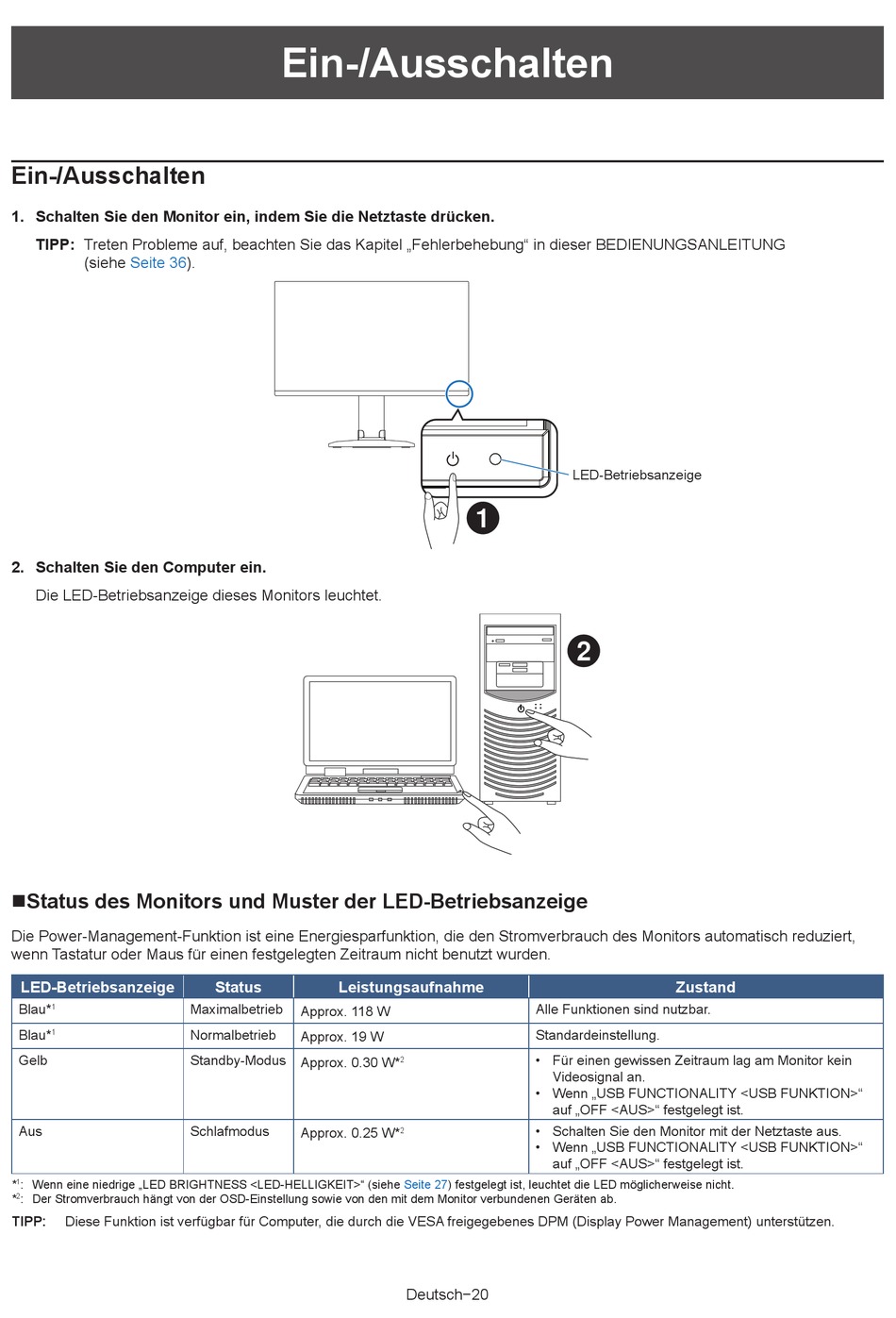 nStatus des Monitors und Muster der LED-Betriebsanzeige