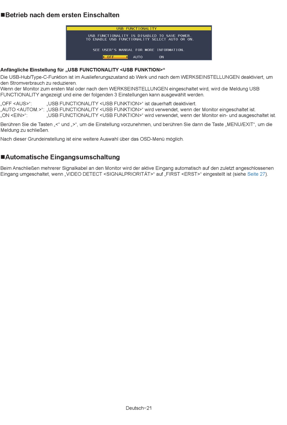 „AUTO <AUTOM.>": „USB FUNCTIONALITY <USB FUNKTION>" wird verwendet, wenn der Monitor eingeschaltet ist.