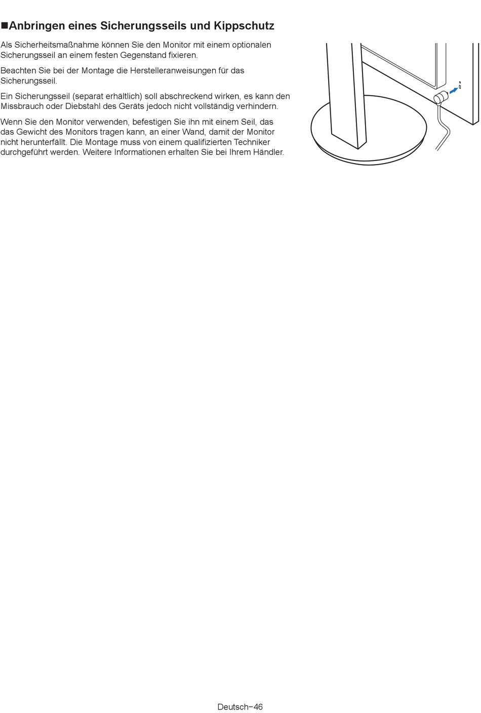 Wenn Sie den Monitor verwenden, befestigen Sie ihn mit einem Seil, das