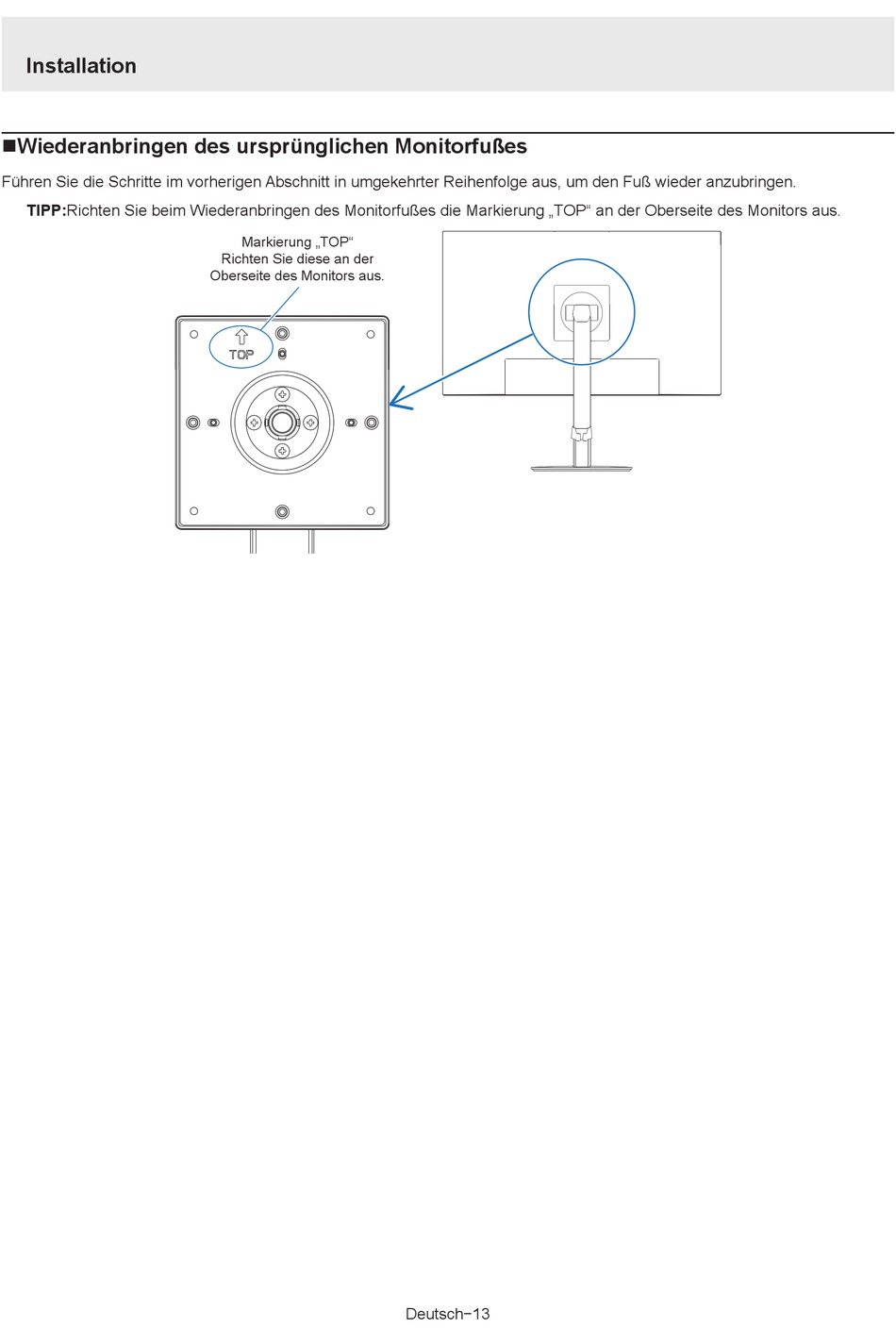 Richten Sie beim Wiederanbringen des Monitorfußes die Markierung „TOP" an der Oberseite des Monitors aus.