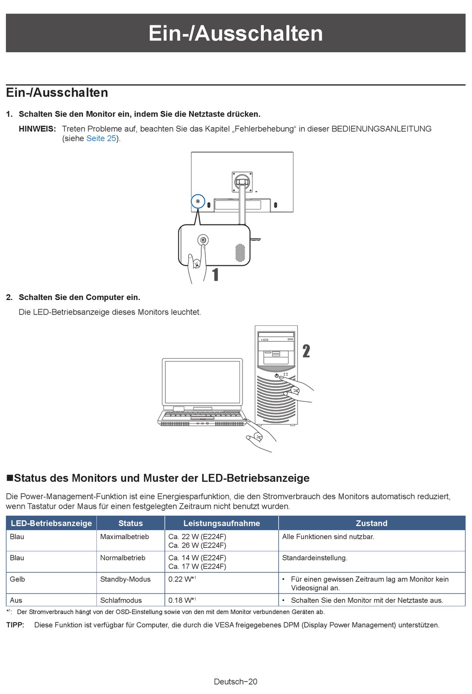 nStatus des Monitors und Muster der LED-Betriebsanzeige