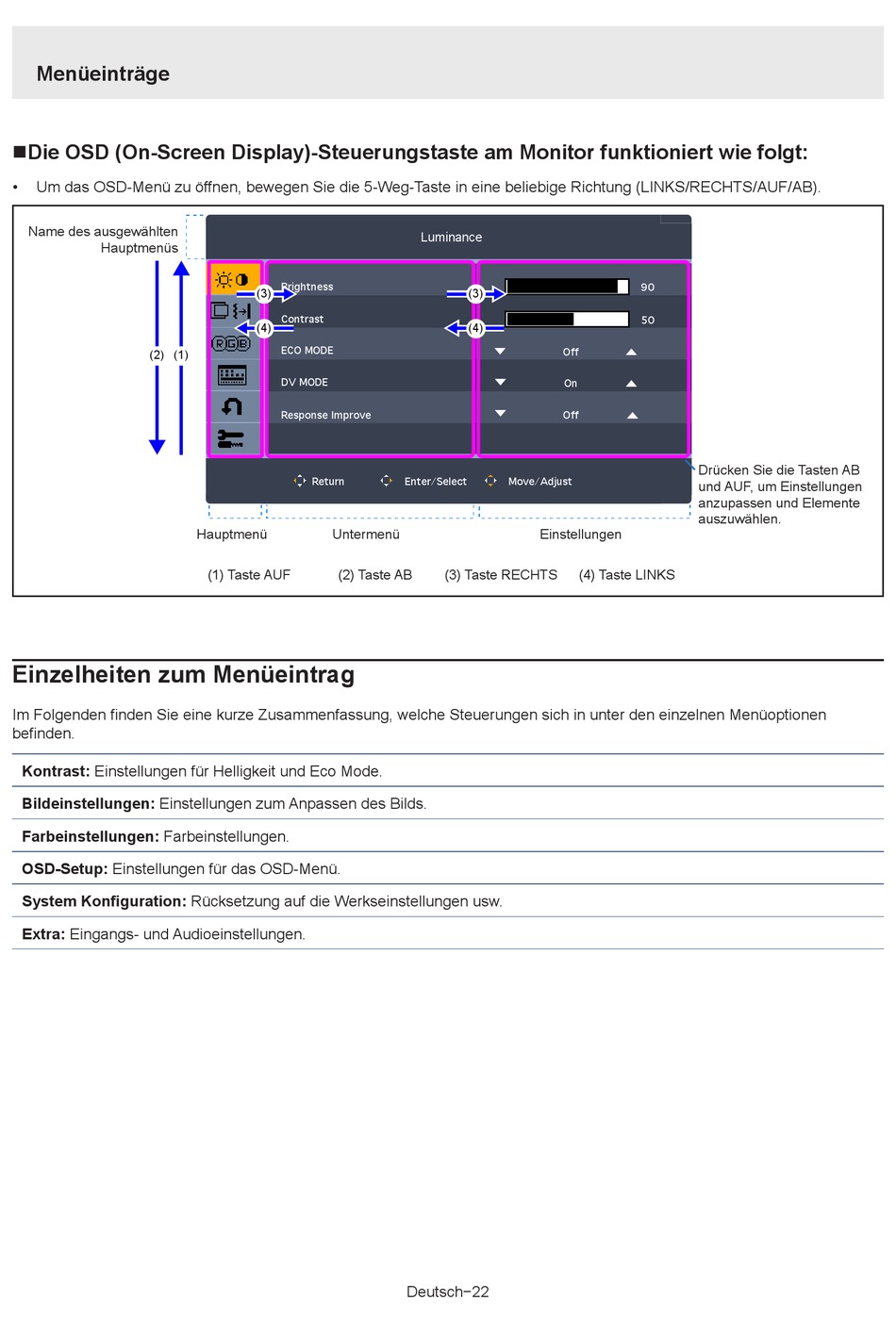 nDie OSD (On-Screen Display)-Steuerungstaste am Monitor funktioniert wie folgt: