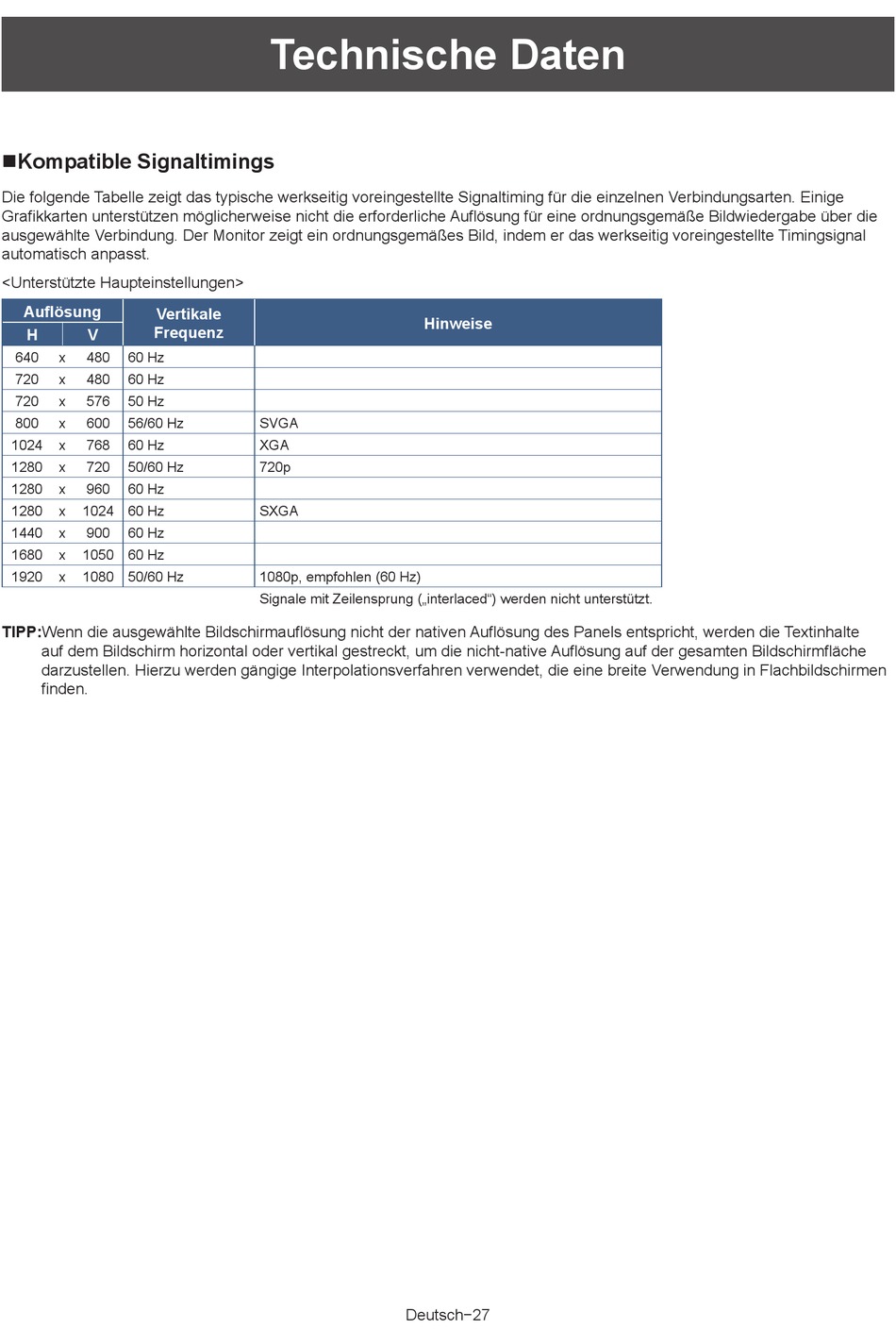 Die folgende Tabelle zeigt das typische werkseitig voreingestellte Signaltiming für die einzelnen Verbindungsarten. Einige