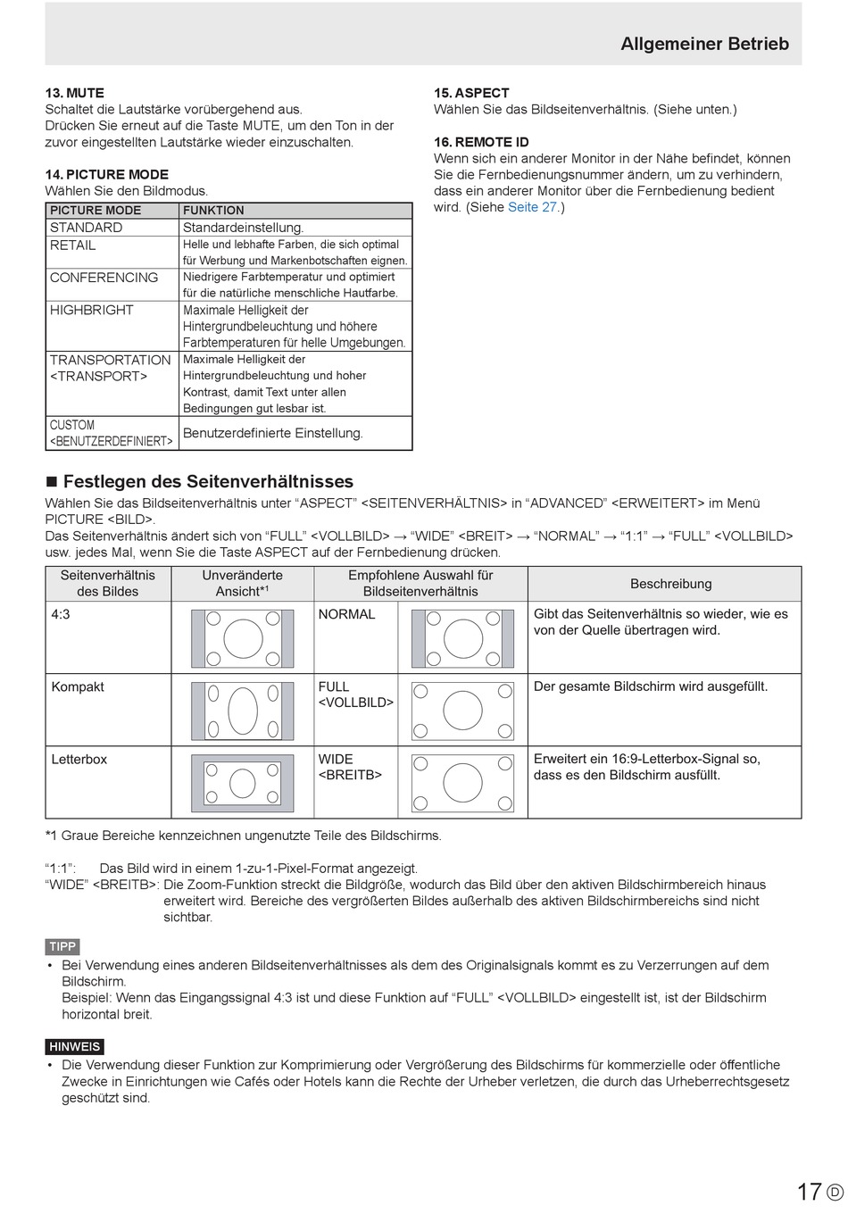 Das Seitenverhältnis ändert sich von "FULL" <VOLLBILD> → "WIDE" <BREIT> → "NORMAL" → "1:1" → "FULL" <VOLLBILD>