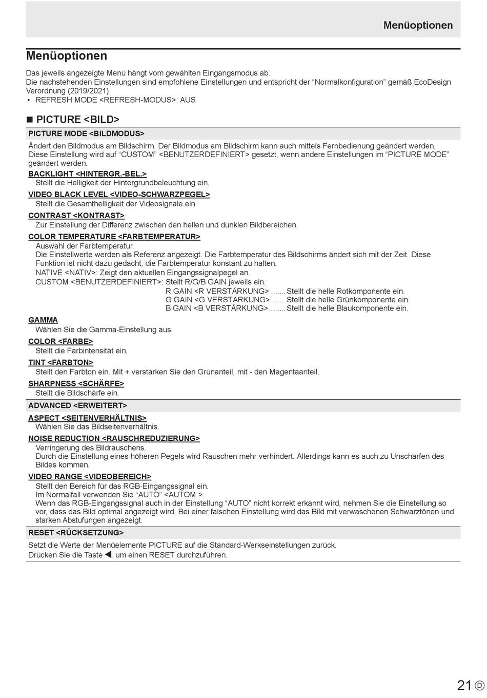 Setzt die Werte der Menüelemente PICTURE auf die Standard-Werkseinstellungen zurück.
