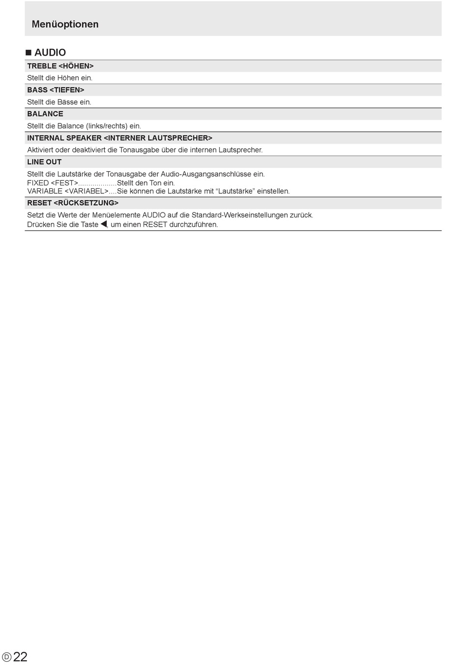 Setzt die Werte der Menüelemente AUDIO auf die Standard-Werkseinstellungen zurück.