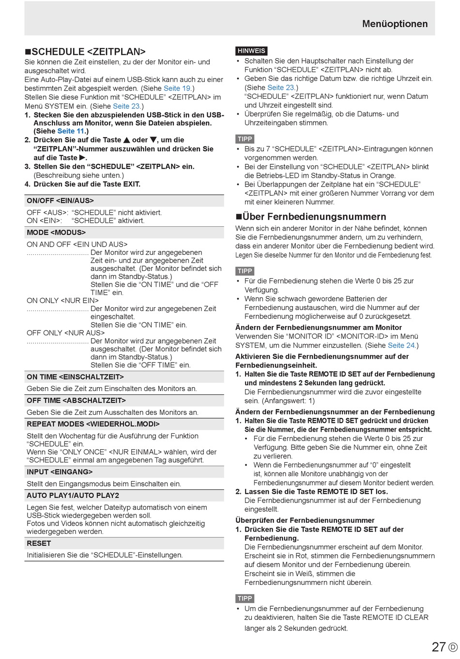 • Bis zu 7 "SCHEDULE" <ZEITPLAN>-Eintragungen können