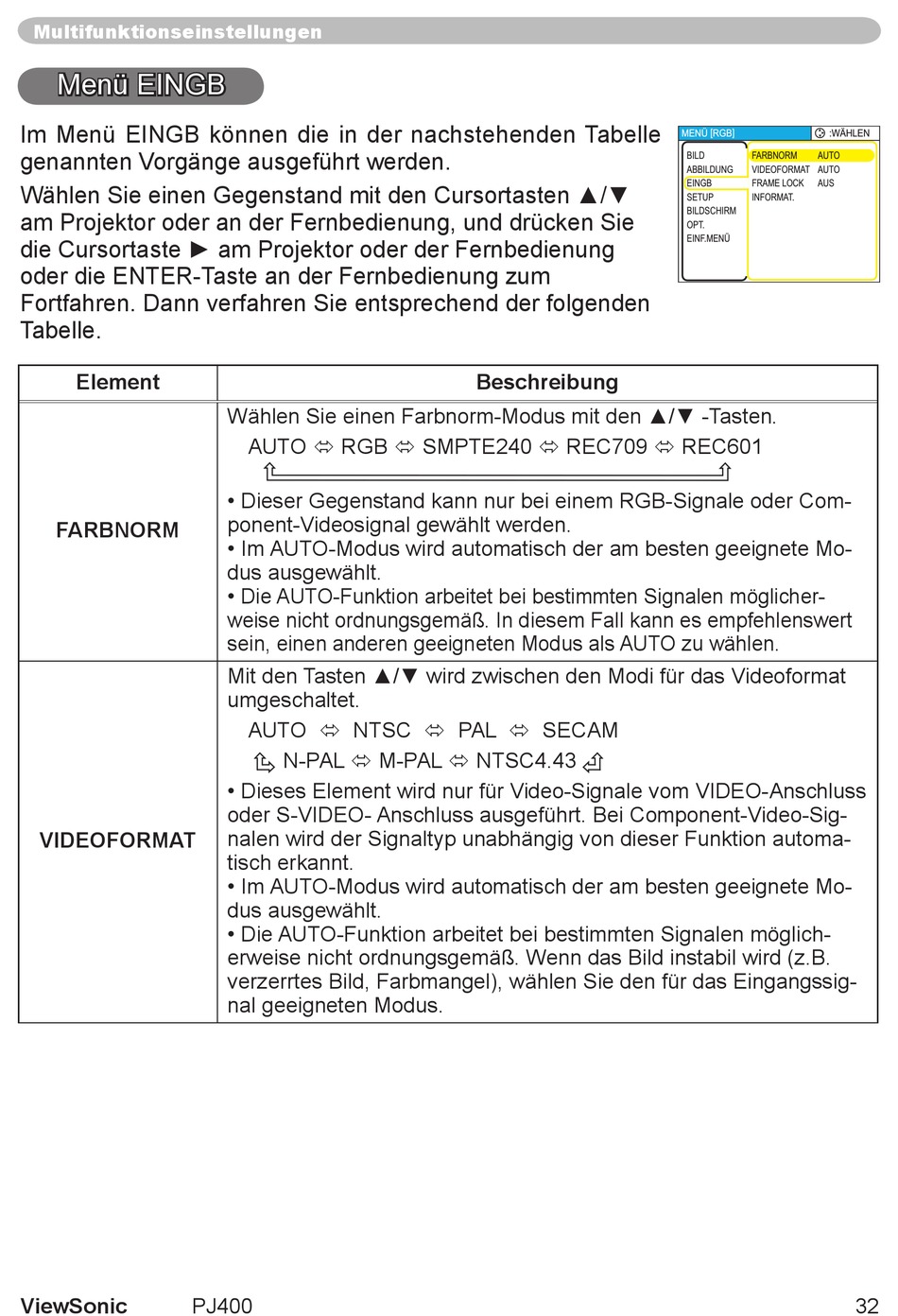 Im Menü EINGB können die in der nachstehenden Tabelle