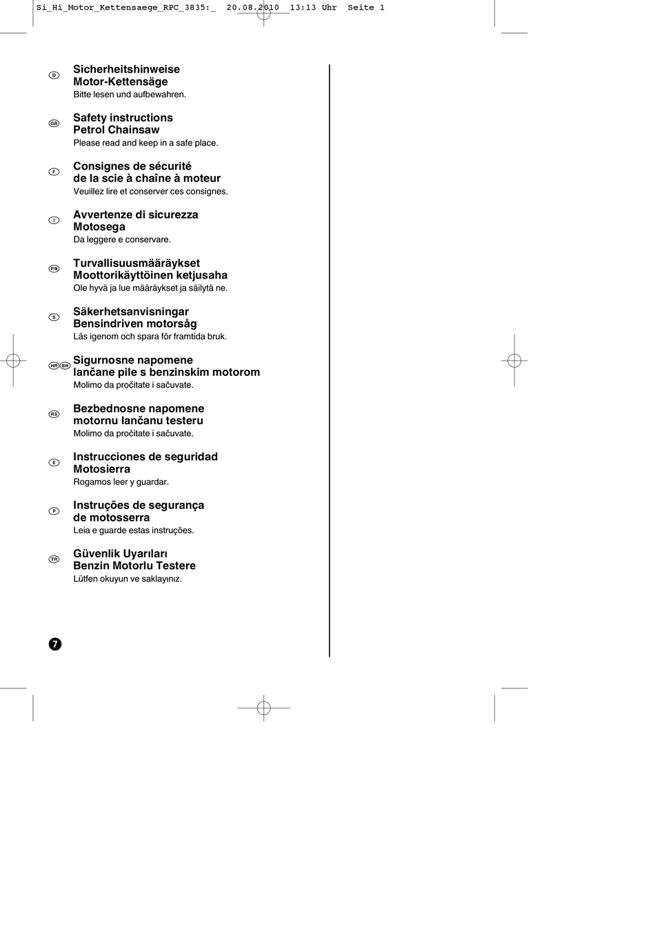 Si_Hi_Motor_Kettensaege_RPC_3835:_ 20.08.2010 13:13 Uhr Seite 1 Sicherheitshinweise Motor-Kettensäge Bitte lesen und aufbewahren. Safety instructions Petrol Chainsaw Please read and keep in a safe place. Consignes de sécurité de la scie à chaîne à moteur Veuillez lire et conserver ces consignes. Avvertenze di sicurezza Motosega Da leggere e conservare.