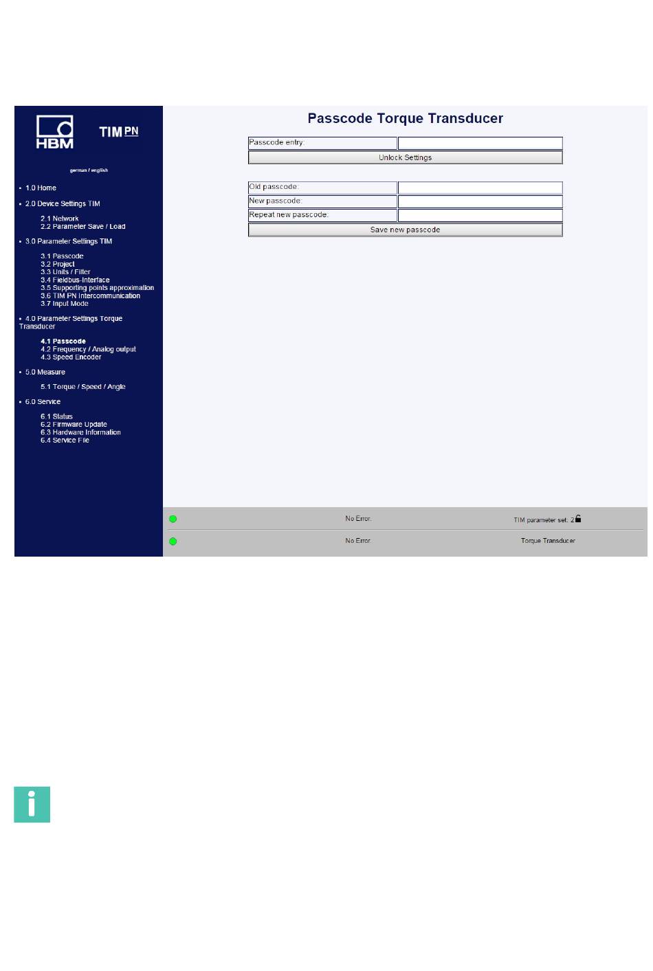 You can make settings to the torque transducer in the Passcode entry menu. Various