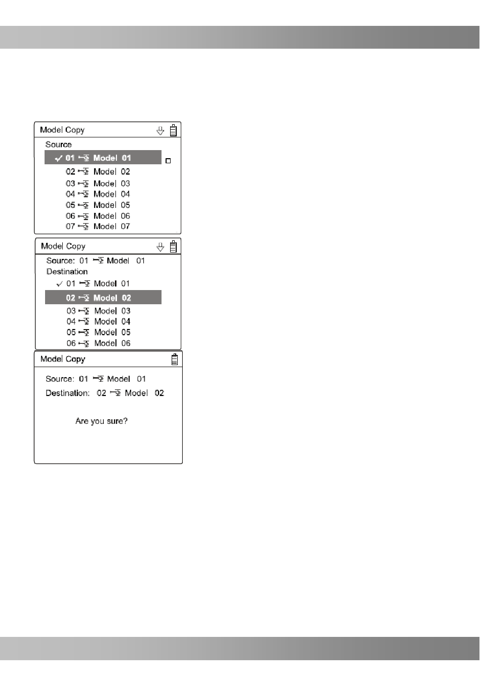 Wählen Sie mit [UP] und [DN] das Modell aus, dessen Kopie an eine andere DEVO F12E
