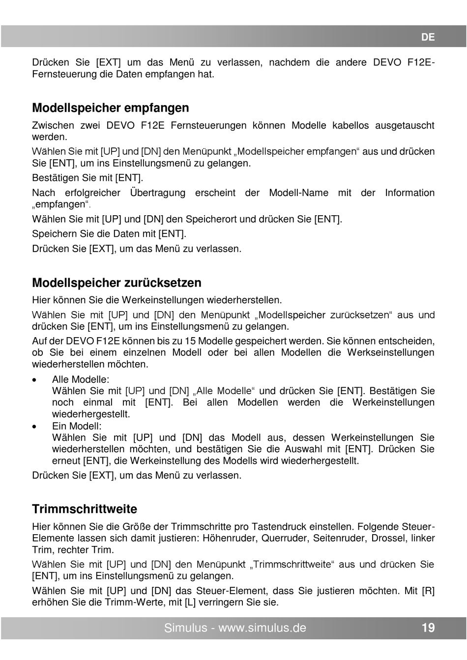 Zwischen zwei DEVO F12E Fernsteuerungen können Modelle kabellos ausgetauscht