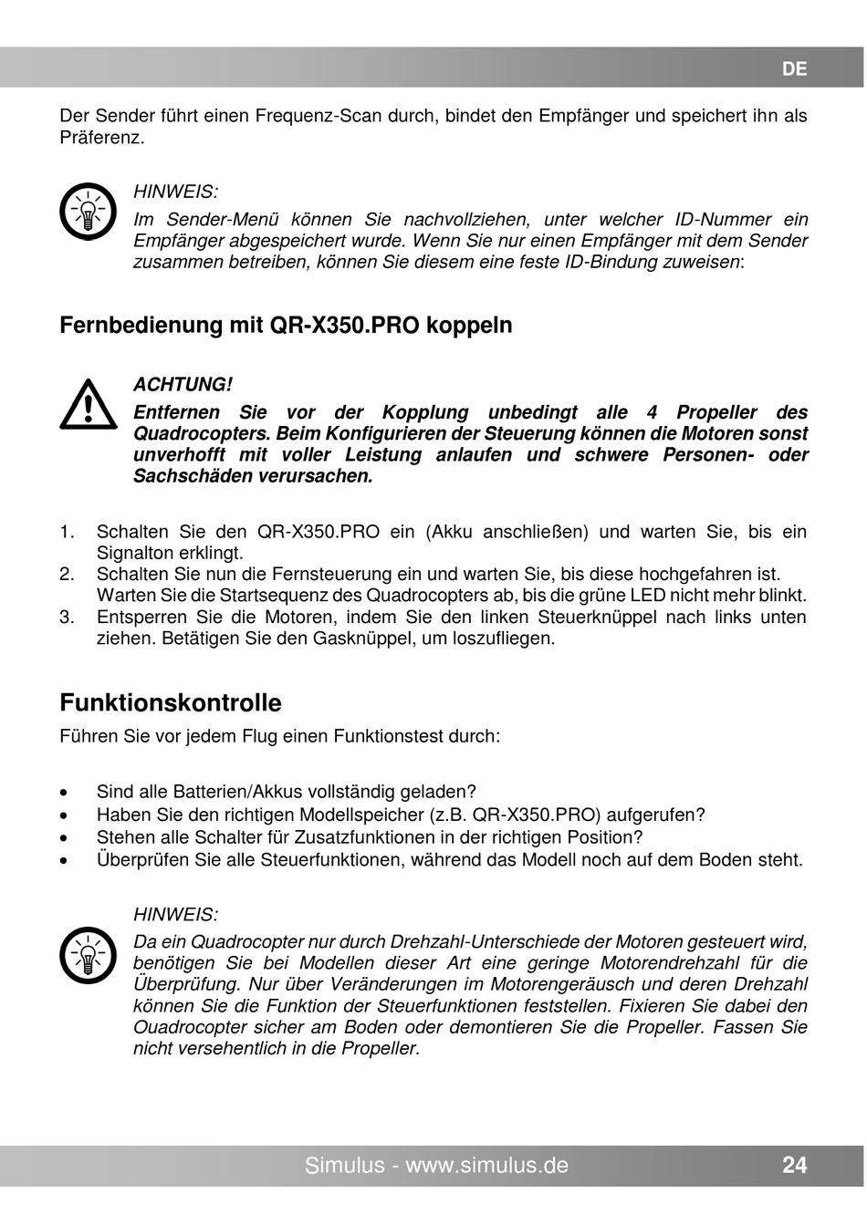 Führen Sie vor jedem Flug einen Funktionstest durch: